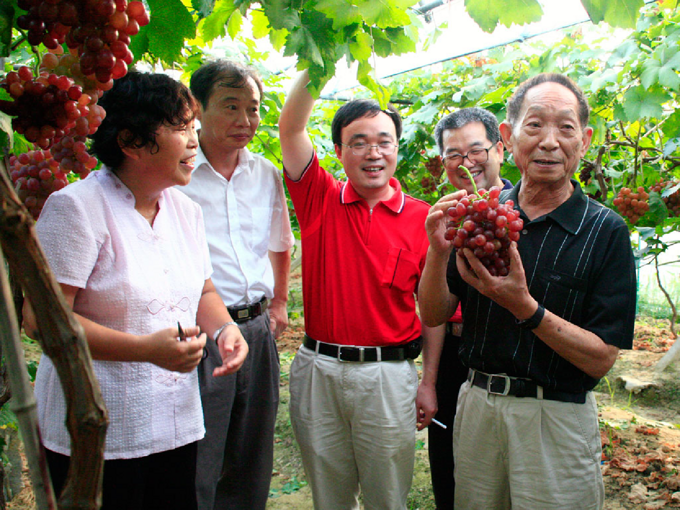 2008年8月15日,袁隆平院士考察湖南农业大学的葡萄园,与石雪晖交流