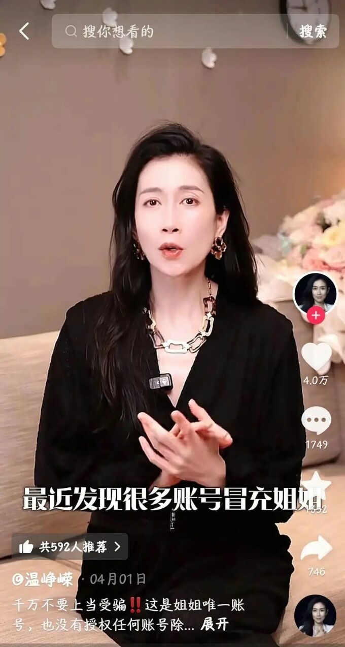 据报道,当前有多个直播间同时出现 “温峥嵘” 的影像,但这些均非她本人出镜。此类内容要么是 AI 合成的虚假直播,要么是盗播、录播的过往片段。
