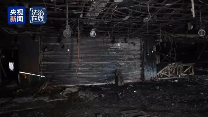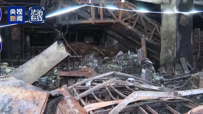 记者在现场看到,起火建筑多处外窗被烧穿,玻璃碎裂,外立面墙体被浓烟熏黑,裙楼的5层和6层最为严重。最先起火的建筑负一层超市内,金属货架被烧得扭曲变形,木质结构的门框、隔板、木架已严重炭化,整个超市一片狼藉。