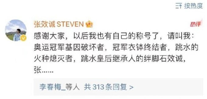 吴敏霞老公张效诚在评论区调侃自己:请叫我“奥运冠军基因破坏者”“冠军衣钵终结者”“跳水活动熄灭者”......