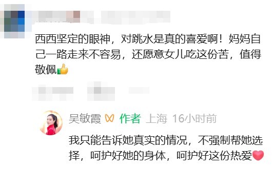在最新视频的评论区,吴敏霞回复网友称,不强制帮女儿选择,呵护好她的身体和这份热爱。