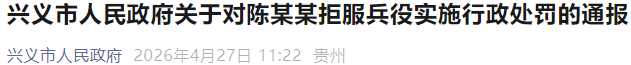 4月27日,贵州黔西南州兴义市人民政府发布通报,对陈某某拒服兵役实施行政处罚。