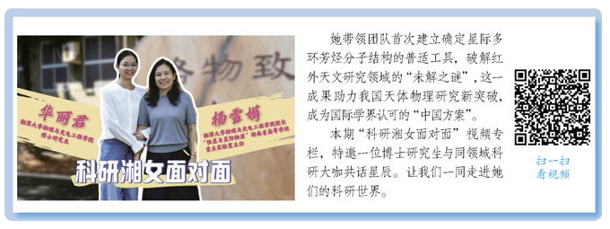 杨雪娟是一名土生土长的湘女科学家,在“仰望星空”的前沿赛道上做出了备受瞩目的成绩。她带领团队突破学科壁垒,首次建立了确定星际多环芳烃分子结构的普适工具,破解了红外天文研究领域的“未解之谜”。这份成果不仅助力我国天体物理研究新突破,还被写入英美顶尖教材,成为国际学界认可的“中国方案”。