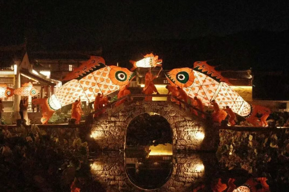 灯身用竹篾扎成,糊上彩纸,里面点着 LED 灯,随着脚步摇曳,仿佛一条条活灵活现的鱼儿在夜色中游动。村民们穿着传统服饰,敲着锣鼓,吹着唢呐,气氛热烈。中途,在古色古香的石桥上,还会有村民表演舞鱼灯,与夜幕中的烟花互相辉映。