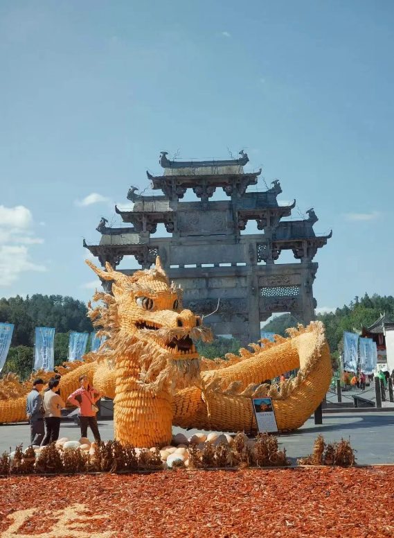 村口的胡文光刺史牌坊在秋阳下更显庄重,牌坊上的砖雕历经百年仍清晰可辨,秋风吹过牌坊下的古柏,落叶簌簌作响。季节限定的玉米巨龙在阳光下闪闪发光,秋日丰收的喜悦扑面而来。