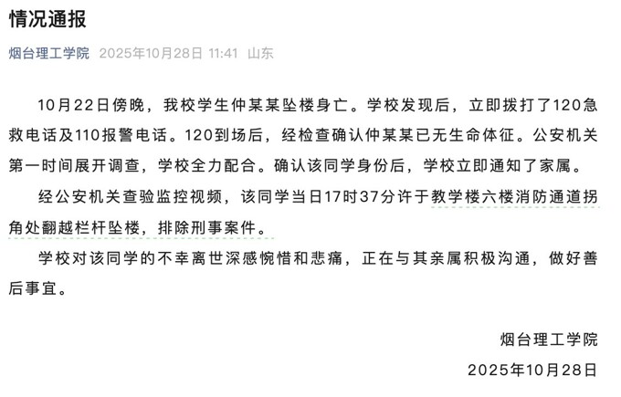 10月22日傍晚,我校学生仲某某坠楼身亡。学校发现后,立即拨打了120急救电话及110报警电话。120到场后,经检查确认仲某某已无生命体征。公安机关第一时间展开调查,学校全力配合。确认该同学身份后,学校立即通知了家属。