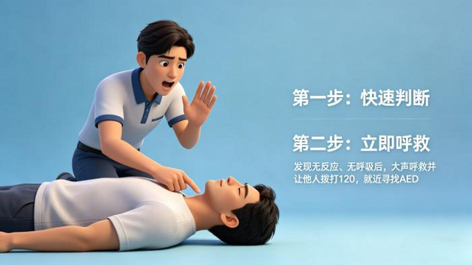 快速判断,立刻呼救:确认环境安全后,轻拍患者双肩呼喊,无反应立即让人拨打 120,同时就近寻找 AED。