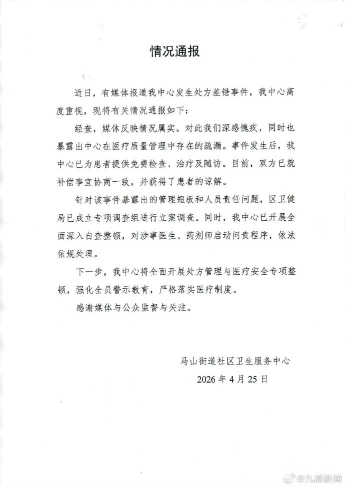 针对该事件暴露出的管理短板和人员责任问题,区卫健局已成立专项调查组进行立案调查。同时,我中心已开展全面深入自查整顿,对涉事医生、药剂师启动问责程序,依法依规处理。