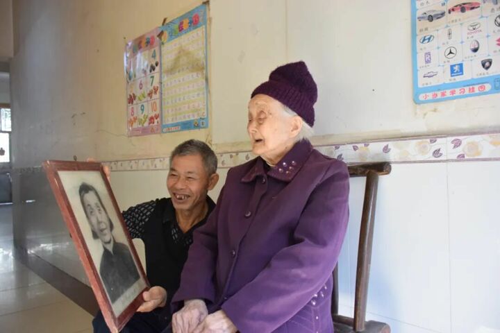 70岁的小儿子肖汉武陪105岁的母亲谭爱胆看她的肖像。