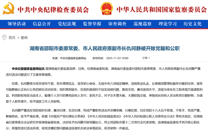 11月3日,据中央纪委国家监委网站消息:日前,经湖南省委批准,湖南省纪委监委对邵阳市委原常委、市人民政府原副市长仇珂静严重违纪违法问题进行了立案审查调查。