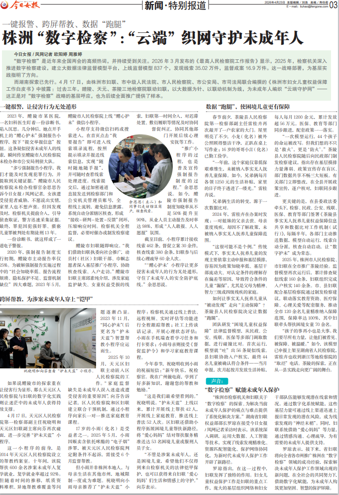 “株洲市检察机关和妇联系统关于‘数字检察’的探索,为解决当前未成年人保护的痛点与难点提供了系统化解决方案。”湖南省妇联权益部部长罗琼在接受今日女报/凤网记者采访时表示,该系统深入调研,运用大数据、人工智能等技术,实现了线索发现精准化、资源匹配智能化、保护网络协同化,为新时代未成年人保护工作开辟了新路径。