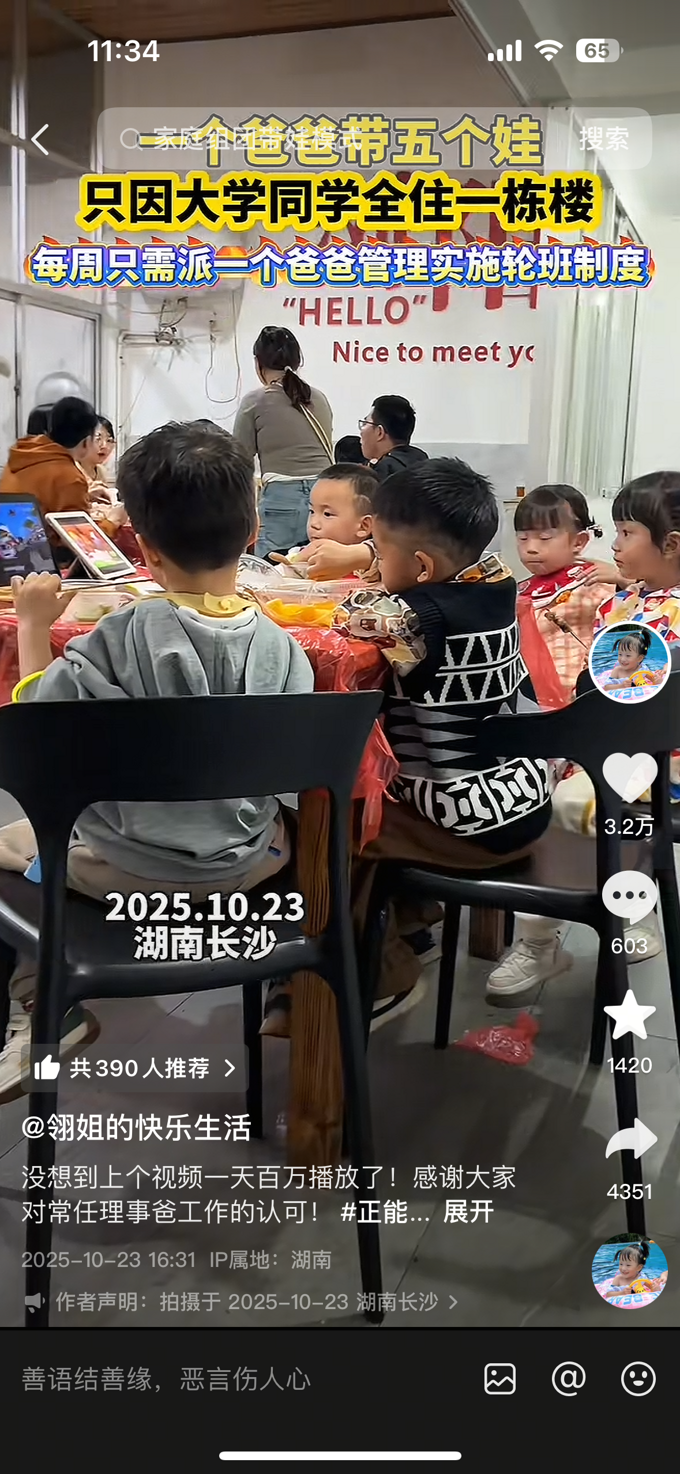 视频里的4位“90后”父亲不仅是同窗多年的大学好友,如今更成了育儿路上的“最佳战友”。他们打破传统“各家带各家”的零散育儿模式,创新推出“轮值带娃”的集体育儿方案,让曾经令人头疼的带娃琐事,变成了大人与孩子共同享受的欢乐时光。