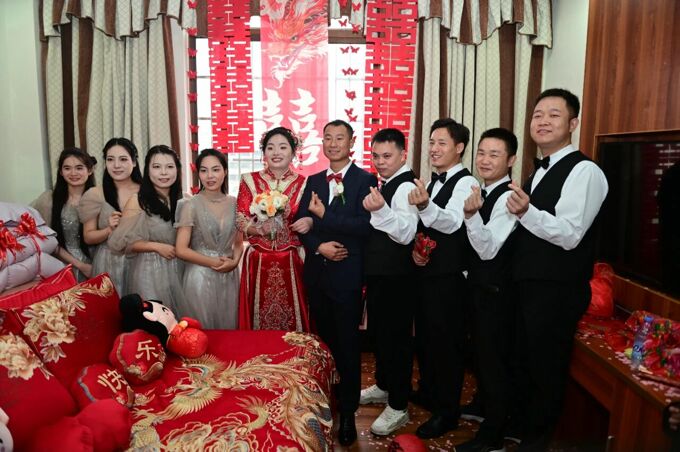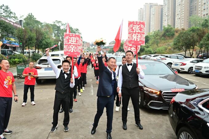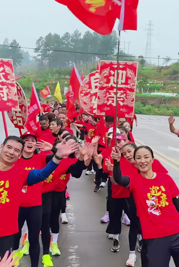 大家还一起设计了定制迎亲T恤——正面印着新人名字,背面写着“跑向幸福”,配上红色的迎亲立牌,传统喜庆与运动活力完美融合。