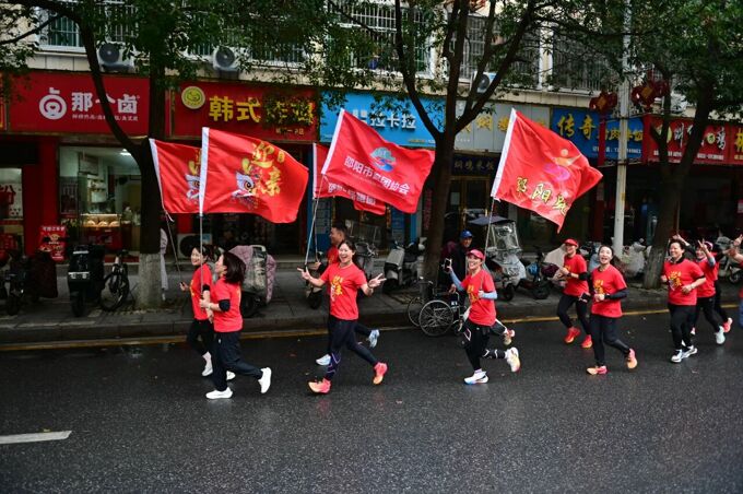 11月1日清晨,邵阳市新邵县的街道,被一阵整齐的脚步声打破了宁静。260名身着红色衣服的跑者列成方阵,手举“新婚快乐”的喜庆立牌,簇拥着一对特殊的新人——新郎张津湘紧牵新娘谢媛的手,踩着轻快步伐向前慢跑。当阳光洒在两人含笑的脸上,这场“跑”出来的婚礼,瞬间成了街头最动人的风景。