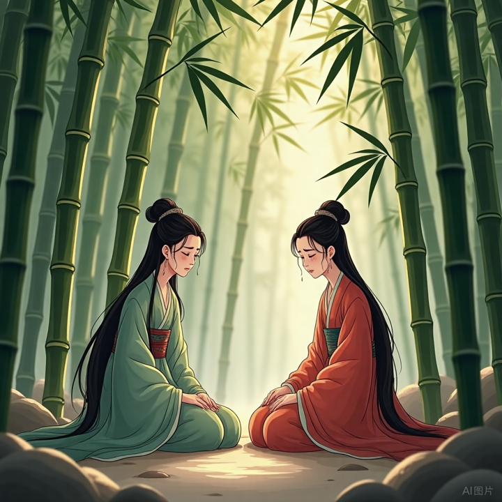 到了湘江边,一听夫君没了,姐妹俩哭到肝肠寸断,眼泪洒在竹子上,竟染出点点斑痕,这就是“湘妃竹”的由来。