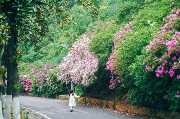 免费入园,沿着车道往里走,不出5分钟就被氛围感拉满——长长的绝美杜鹃花墙出现在面前。粉紫、玫红的杜鹃紧密簇拥,沿着步道蜿蜒铺开,形成一面浪漫又治愈的花墙。层层叠叠缀满枝头,风一吹,花朵轻轻摇动,牵着孩子的小手站在花墙前,温柔又出片。